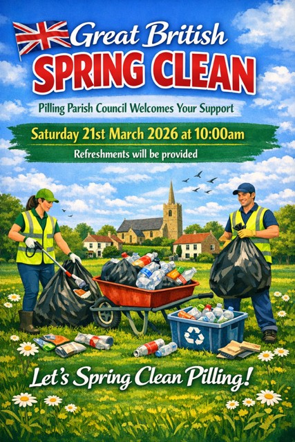 Pilling Parish Council are arranging a 'litter pick' on Saturday 21st March as part of the 'Great British Spring Clean' and would welcome volunteers.